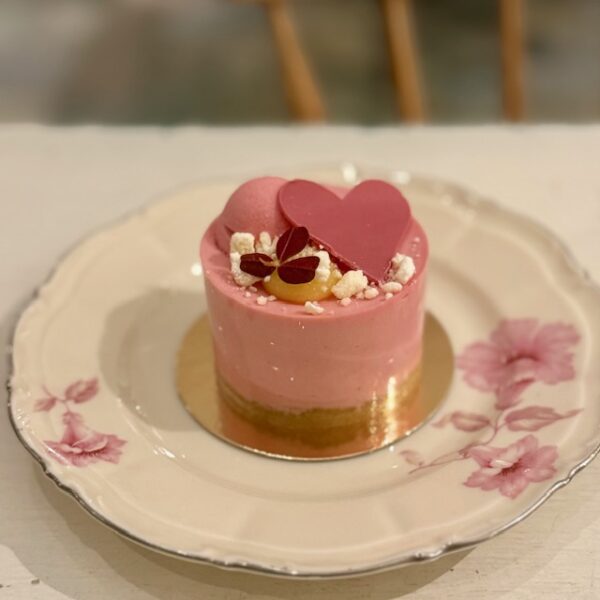 En rosa ekologisk skogsbärsbiskvi. Mandelbotten (utan gluten), en liten gömma med blåbärssylt, chokladtryffel med hallon, doppad i choklad.