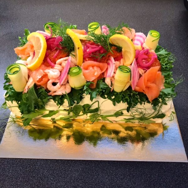Bottnarna är bakade på ekologiska råvaror. Fyllningen är gjord på ekologisk creme fraiche, ekologisk majonnäs, gravad lax och ekologisk citron. Smörgåstårtan är dekorerad med ekologiska grönsaker, ägg från Klöverbergsgården, gravad lax och handskalade räkor.